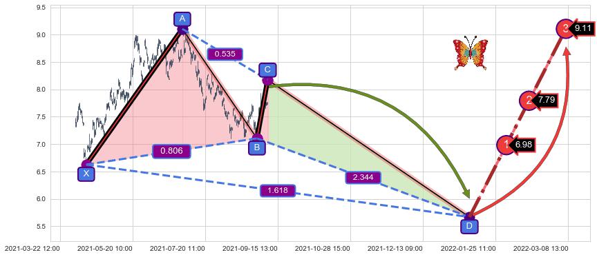 ➢ 距离预测D点位置有足够的下跌空间, 与看涨【蝴蝶】形态相反,实际方向【看跌】