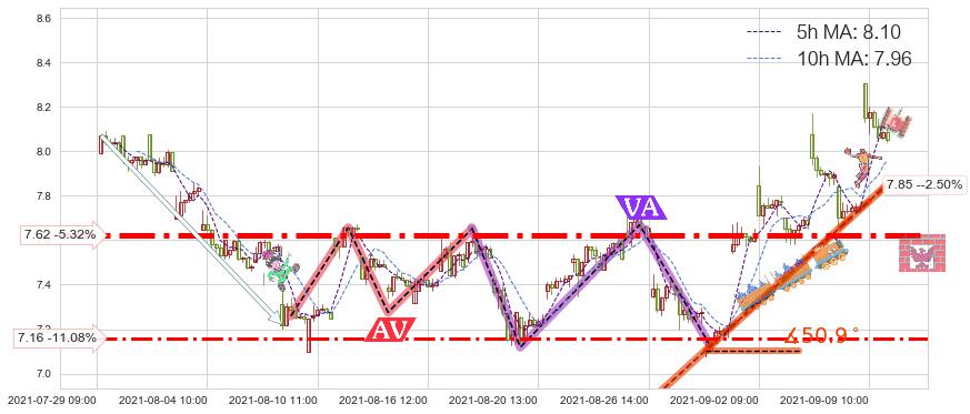 ♘ 支撑价格位7.62,可信任强度87.61%,距离最后交易2021-09-09 14:00形成的收盘价格8.05相差 -5.32%