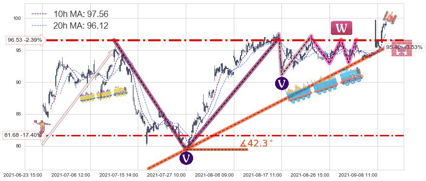 ♞ 10小时均线:97.56,20小时均线:96.12→ 快线>慢线