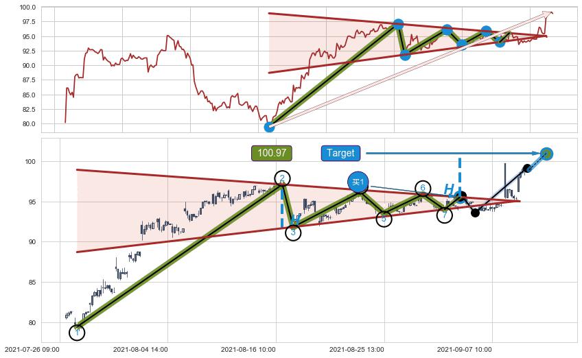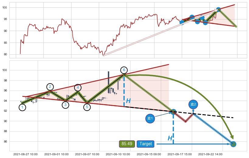 ➢ 最小中继整理涨幅→𝐇: 5.44 (高点逐步降低斜边第一阻力点②与支撑边垂直距离)