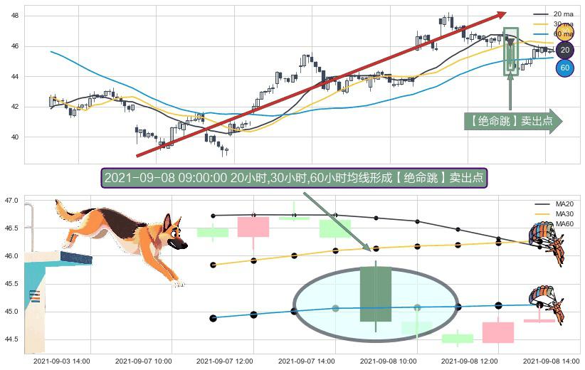 形态多维评估: ⚀ 2021-09-08 09:00:00小时显现 20小时-30小时-60小时均线 【绝命跳】卖出点 看空信号,后市看跌,卖出