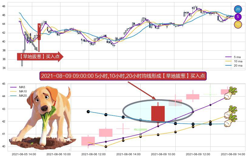 形态多维评估: ⚀ 2021-08-09 09:00:00小时显现 5小时-10小时-20小时均线 【旱地拔葱】买入点 看多信号,后市看涨,买入