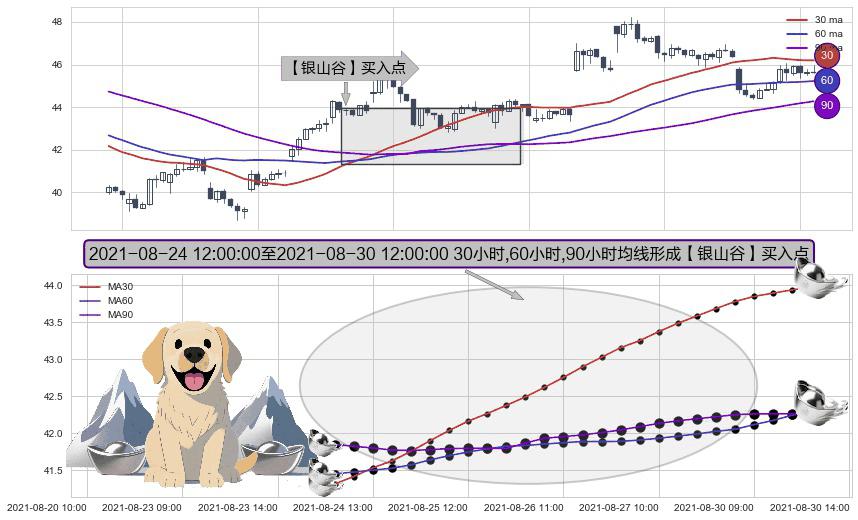 形态多维评估: ⚀ 2021-08-24 13:00:00-小时至2021-08-30 12:00:00-小时显现 30小时-60小时-90小时均线 【银山谷】买入点 看多信号,后市看涨,买入