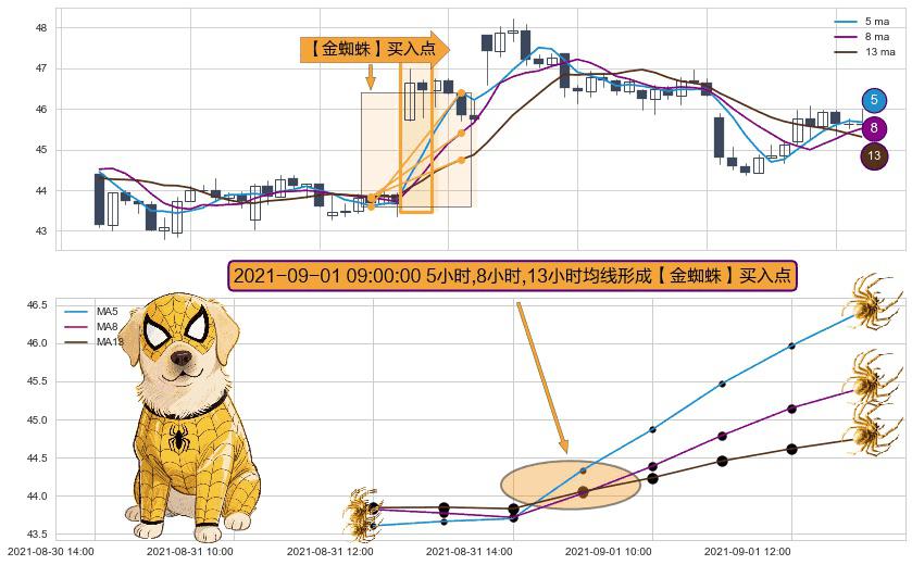 形态多维评估: ⚀ 2021-09-01 09:00:00小时显现 5小时-8小时-13小时均线 【金蜘蛛】买入点 看多信号,后市看涨,买入