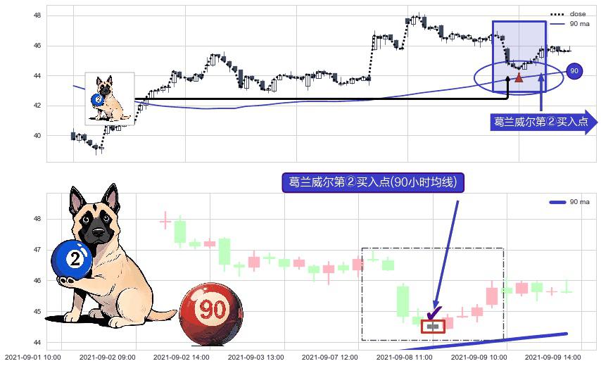 形态多维评估: ⚀ 2021-09-08 11:00:00-小时显现 葛兰威尔均线 90小时均线 第②买入点 上升趋势的中继信号,后市看涨,买进信号
