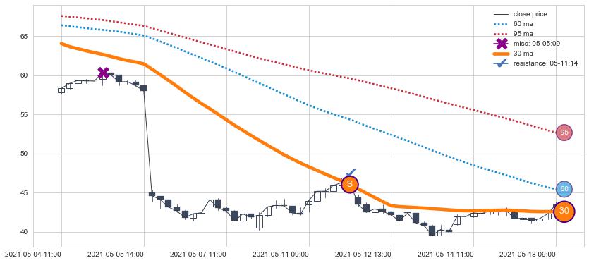 下跌趋势05-04 11:00-05-18 09:00,均线30确认关键阻力1处