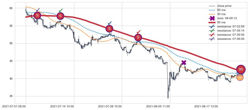下跌趋势07-01 09:00-08-20 14:00,均线95确认关键阻力4处