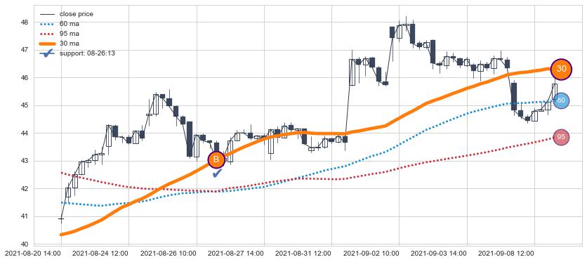 上涨趋势05-19 13:00-07-01 09:00,均线60确认关键支撑2处