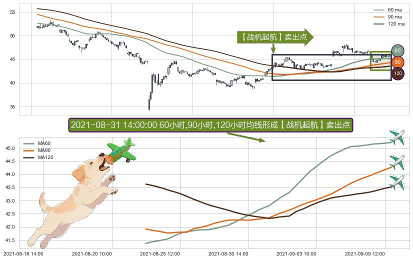 形态多维评估: ⚀ 2021-08-23 14:00:00小时-2021-09-09 14:00:00小时显现 60小时-90小时-120小时均线 【战机起航】卖出点 看空信号,后市看跌,卖出