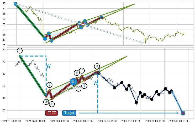 ➢ 最小中继整理跌幅→𝐇: 33.10 (𝐇楔型旗杆的长度:楔型起点→顶点)