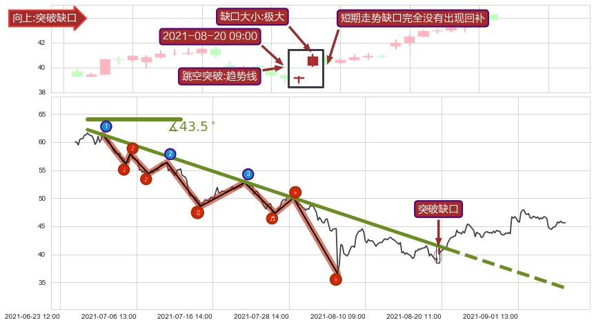 从2021-06-28 11:00至2021-08-23 09:00,共包含237个小时,阶段股价下跌-34.25%,阶段股价变动位移路程比: 1 : 6,下跌趋势角度: 43.5,2021-08-05 09:00向↘︎形成缺口,跳空下跌-18.10%˚