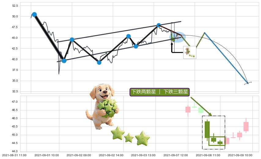 | 3 🅚:三只乌鸦 ➕ 📐:升旗形猜想突破点临近,临近关键支撑位,预期下沉突破下跌 ☞ 看空信号 ⇥ 【🅚线】交织【图形】⇥ 综合量化分数: 48 | > |