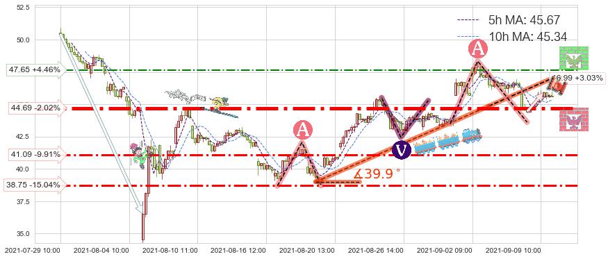 ♘ 阻力价格位47.65,可信任强度52.82%,距离最后交易2021-09-09 14:00形成的收盘价格45.61相差 +4.46%