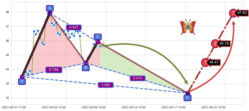 ➣ 未完成【蝴蝶】形态起点X: 08-31:09, 已到达C点: 09-09:11, 预测最终D点: 09-17:14, 共82交易小时