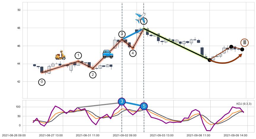 从2021-09-08 11:00至2021-09-09 14:00,共包含10个小时,阶段股价上涨2.64%,阶段股价变动位移路程比: 1 : 1.9