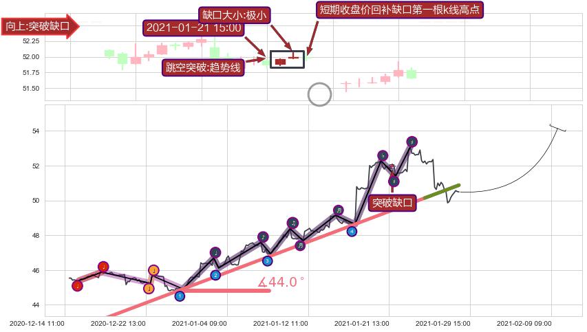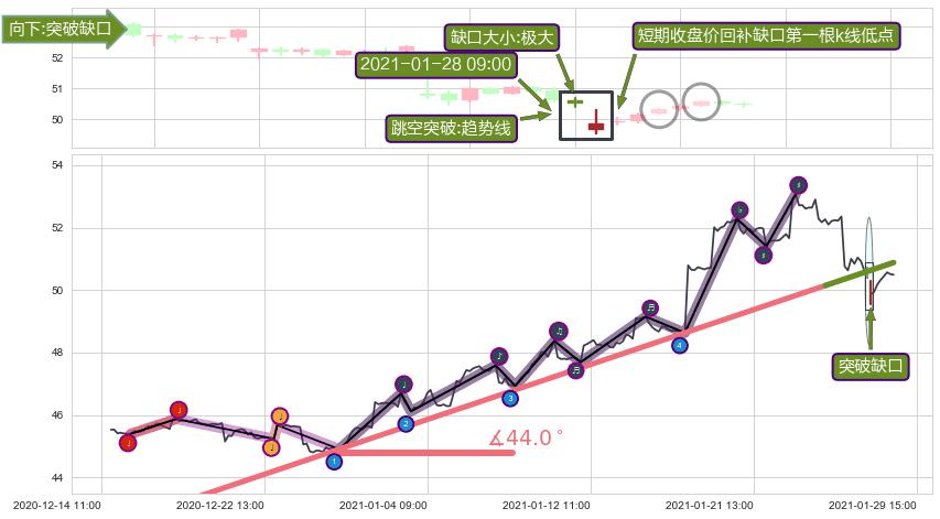 从2020-12-15 12:00至2021-01-26 11:00,共包含214个小时,阶段股价上涨14.40%,阶段股价变动位移路程比: 1 : 3,上涨趋势角度: 44.0,2021-01-19 09:00向⇪形成缺口,跳空上涨+4.44%