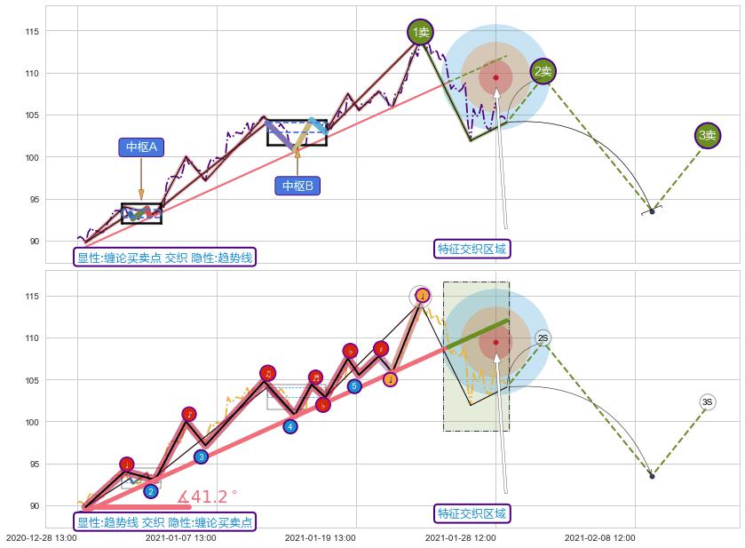 从2020-12-28 16:00至2021-01-20 16:00,共包含109个小时,阶段股价上涨17.69%,阶段股价变动位移路程比: 1 : 3,上涨趋势角度: 42.4