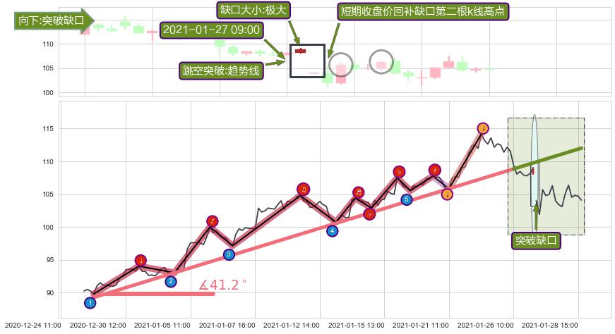 ➣ 2020-12-28 16:00-2021-01-26 10:00上升趋势存在反转[风险],其原上升趋势的支撑位(112.01)已破位[强阻力信号],原上升趋势角度: 41.2˚