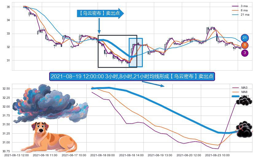 形态多维评估: ⚀ 2021-08-17 11:00:00小时-2021-08-23 12:00:00小时显现 3小时-8小时-21小时均线 【乌云密布】卖出点 看空信号,后市看跌,卖出