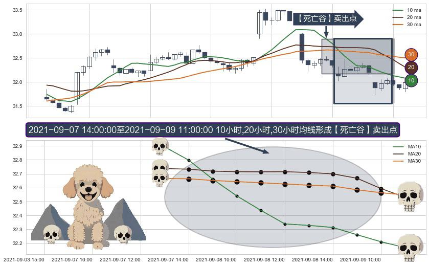 形态多维评估: ⚀ 2021-09-08 09:00:00-小时至2021-09-09 11:00:00-小时显现 10小时-20小时-30小时均线 【死亡谷】卖出点 看空信号,后市看跌,卖出