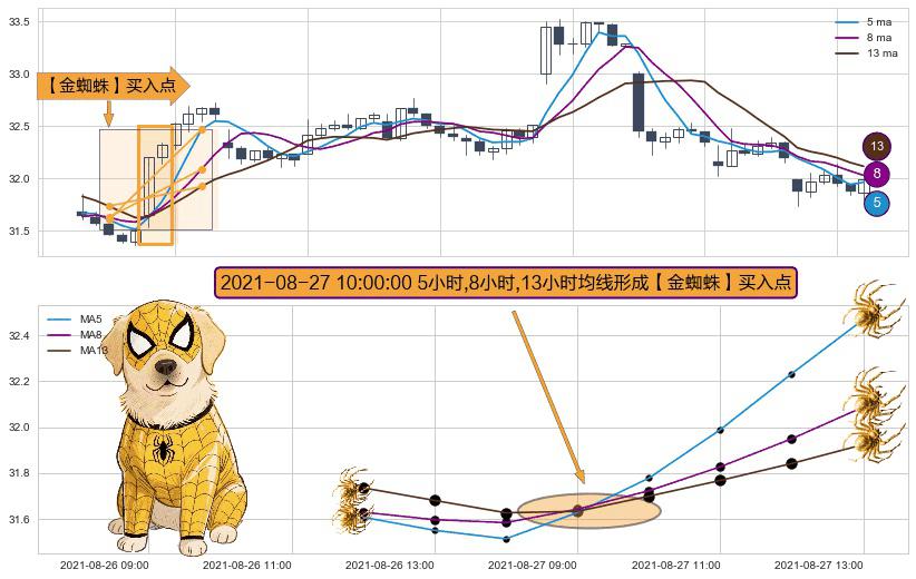 形态多维评估: ⚀ 2021-08-27 10:00:00小时显现 5小时-8小时-13小时均线 【金蜘蛛】买入点 看多信号,后市看涨,买入