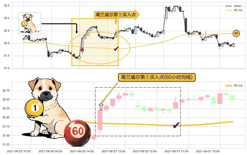形态多维评估: ⚀ 2021-08-27 09:00:00-小时显现 葛兰威尔均线 60小时均线 第买①入点 走势反转见底信号,后市看涨,买进信号