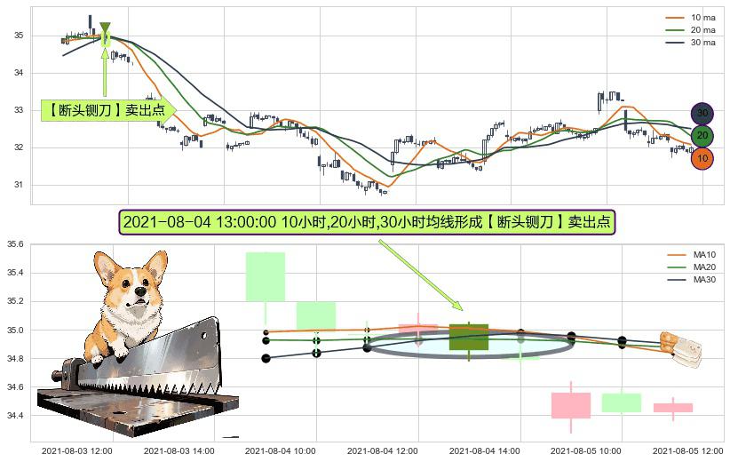 形态多维评估: ⚀ 2021-08-04 13:00:00小时显现 10小时-20小时-30小时均线 【断头铡刀】卖出点 看空信号,后市看跌,卖出