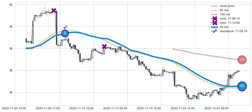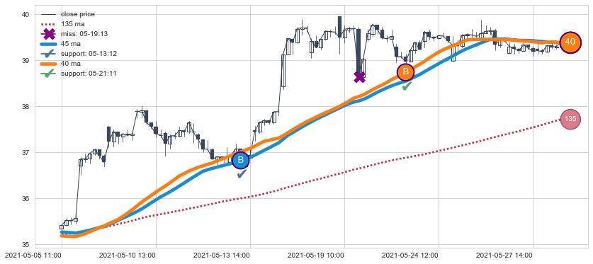 上涨趋势05-05 11:00-05-28 14:00,均线40, 45确认关键支撑2处