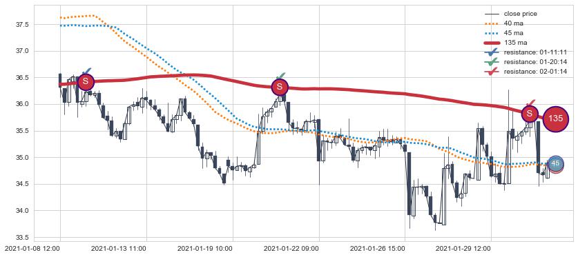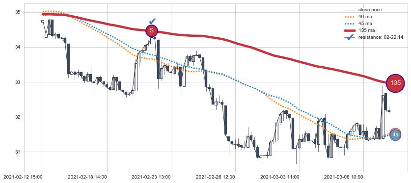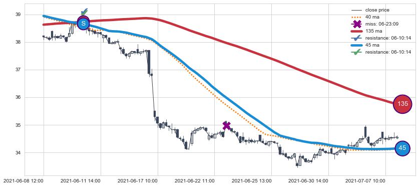 下跌趋势06-08 12:00-07-07 14:00,均线45, 135确认关键阻力1处