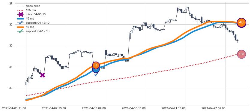 上涨趋势04-01 11:00-04-28 09:00,均线40, 45确认关键支撑1处