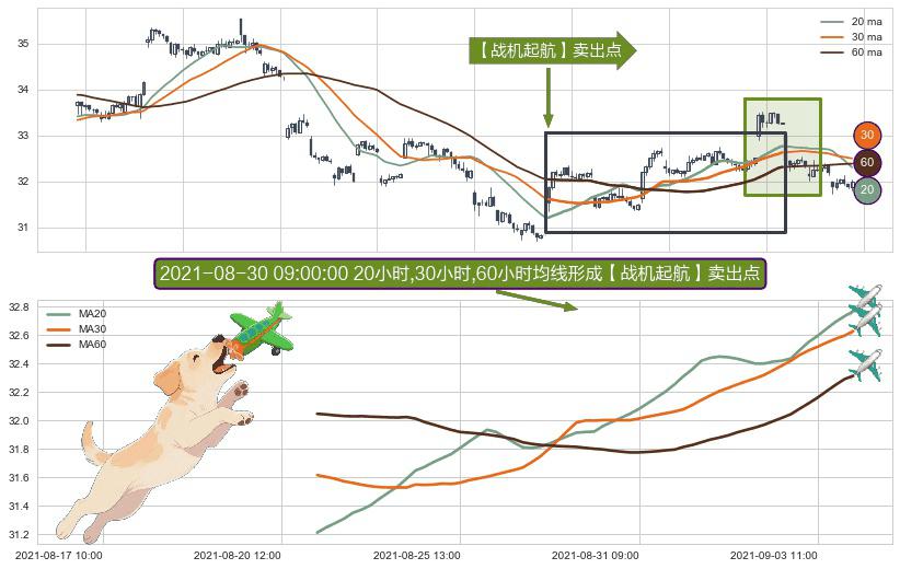 形态多维评估: ⚀ 2021-08-23 09:00:00小时-2021-09-03 15:00:00小时显现 20小时-30小时-60小时均线 【战机起航】卖出点 看空信号,后市看跌,卖出