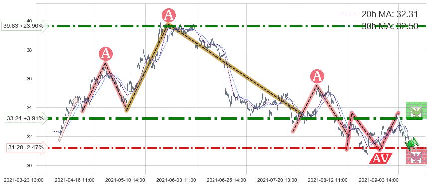 ♘ 阻力价格位33.24,可信任强度87.84%,距离最后交易2021-09-09 14:00形成的收盘价格31.99相差 +3.91%