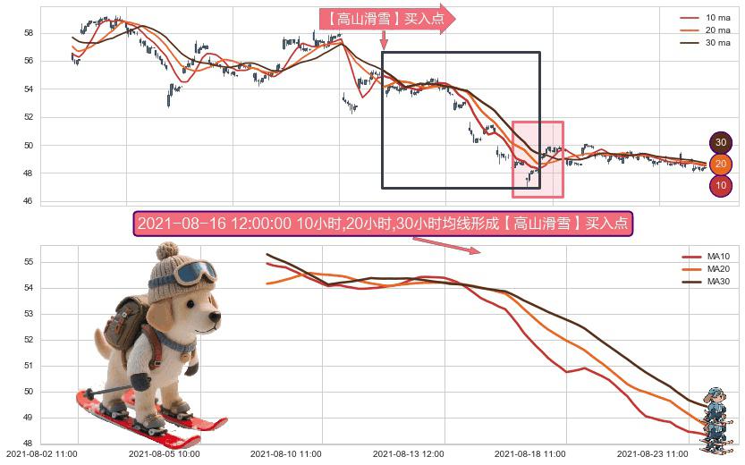 形态多维评估: ⚀ 2021-08-06 15:00:00小时-2021-08-23 14:00:00小时显现 10小时-20小时-30小时均线 【高山滑雪】买入点 看多信号,后市看涨,买入