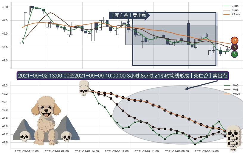 形态多维评估: ⚀ 2021-09-02 14:00:00-小时至2021-09-09 10:00:00-小时显现 3小时-8小时-21小时均线 【死亡谷】卖出点 看空信号,后市看跌,卖出