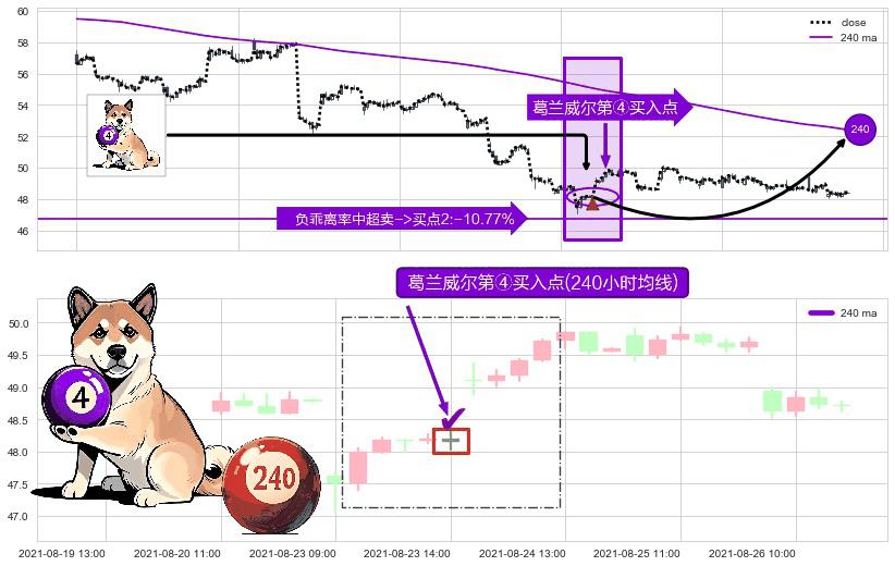 形态多维评估: ⚀ 2021-08-23 14:00:00-小时显现 葛兰威尔均线 240小时均线 第④买入点 下降趋势均值回复的短线反弹信号,后市看涨,买进信号