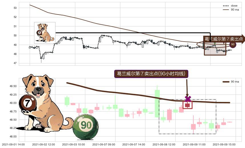 形态多维评估: ⚀ 2021-09-08 14:00:00-小时显现 葛兰威尔均线 90小时均线 第⑦卖出点 下降趋势的中继信号,后市看跌,卖出信号