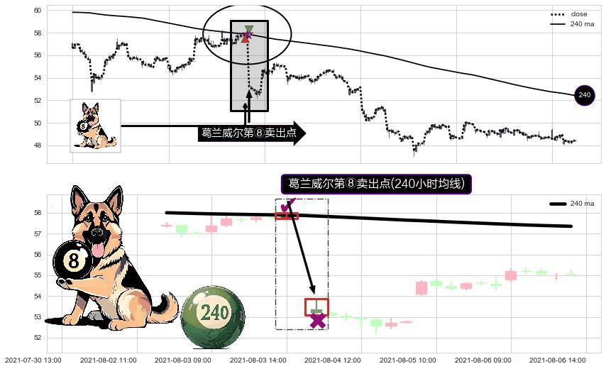 形态多维评估: ⚀ 2021-08-04 09:00:00-小时显现 葛兰威尔均线 240小时均线 第⑧卖出点 下降趋势的中继信号,后市看跌,卖出信号