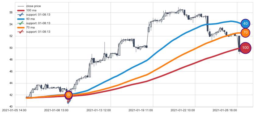 上涨趋势01-05 14:00-01-27 10:00,均线40, 100, 70确认关键支撑1处
