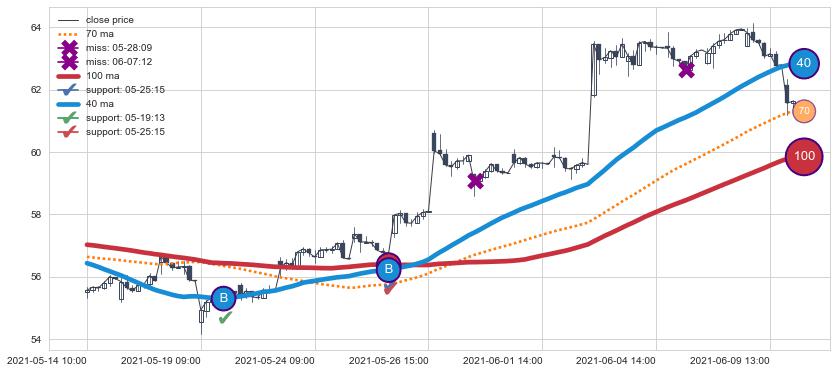 上涨趋势05-14 10:00-06-10 10:00,均线40, 100确认关键支撑2处
