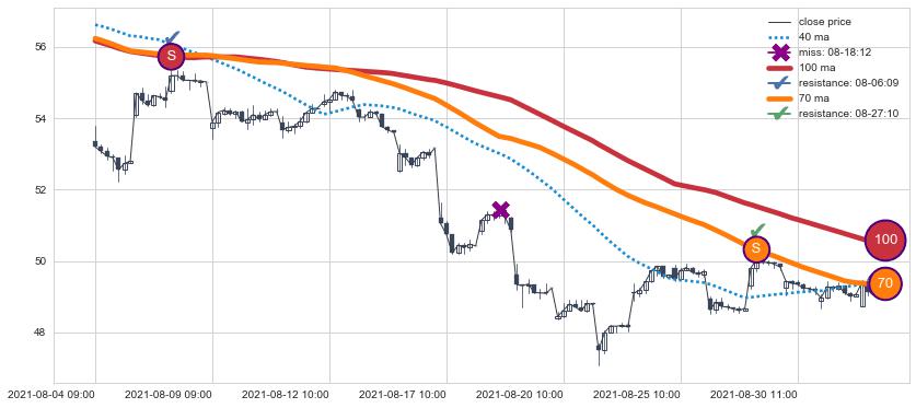 下跌趋势08-04 09:00-09-01 10:00,均线100, 70确认关键阻力2处