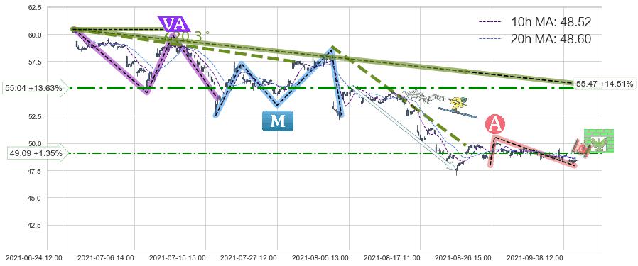 ♘ 在最后的下跌阶段2021-06-25 13:00至2021-08-24 10:00,存在 持续未破位的阻力位 ,阻力价格55.47,可信任强度81.12%,其距离最后价格48.44相差 +14.51%