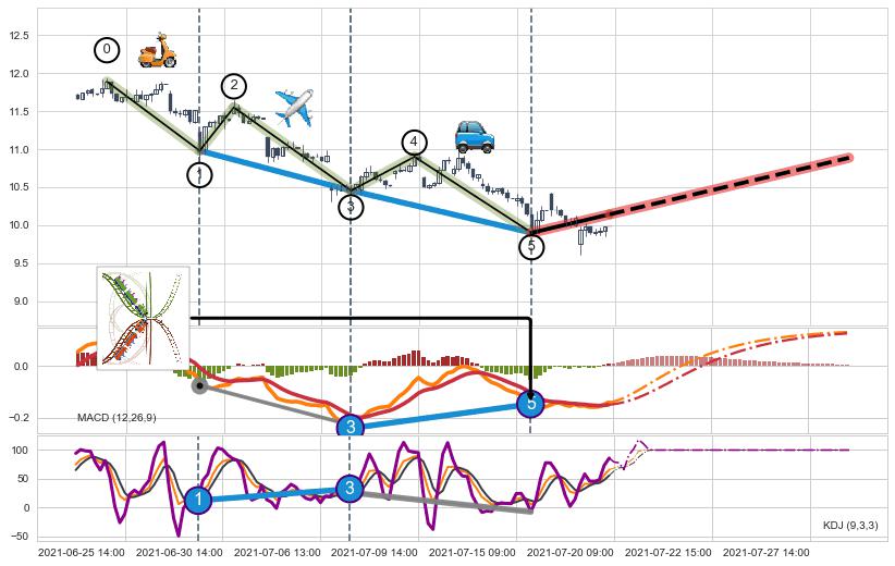 ➣ 第一, 三驱动浪端点:【KDJ】走势出现【常规背离 & 反转信号】背离程度30.43%,背离夹角角度51.9˚,背离程度较小