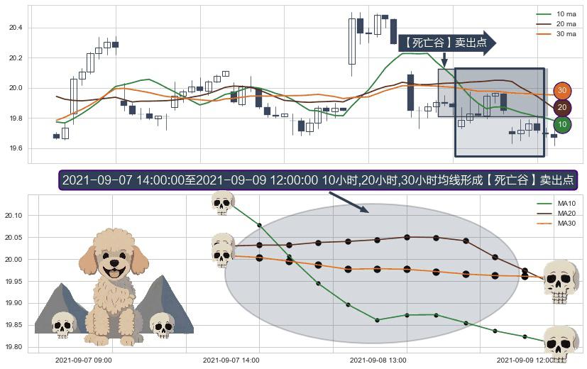 形态多维评估: ⚀ 2021-09-08 09:00:00-小时至2021-09-09 12:00:00-小时显现 10小时-20小时-30小时均线 【死亡谷】卖出点 看空信号,后市看跌,卖出