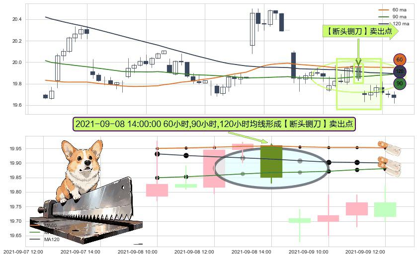 形态多维评估: ⚀ 2021-09-08 14:00:00小时显现 60小时-90小时-120小时均线 【断头铡刀】卖出点 看空信号,后市看跌,卖出