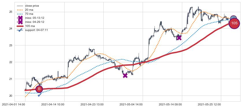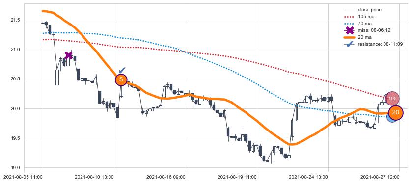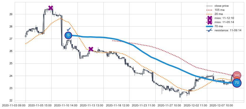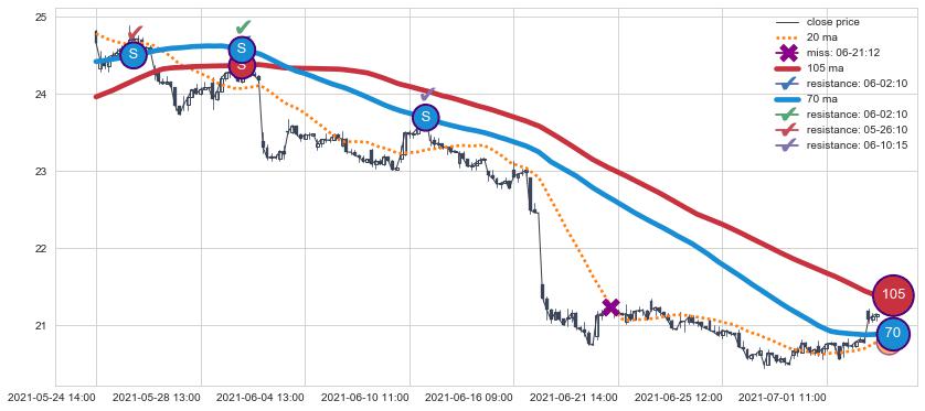下跌趋势05-24 14:00-07-06 11:00,均线105, 70确认关键阻力3处