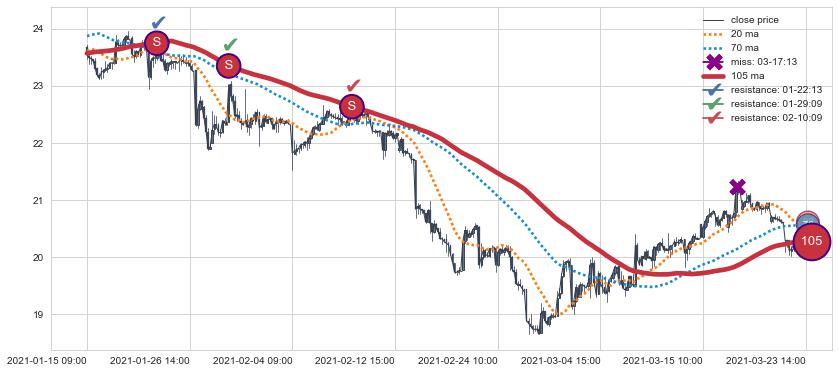 下跌趋势01-15 09:00-03-23 14:00,均线105确认关键阻力3处