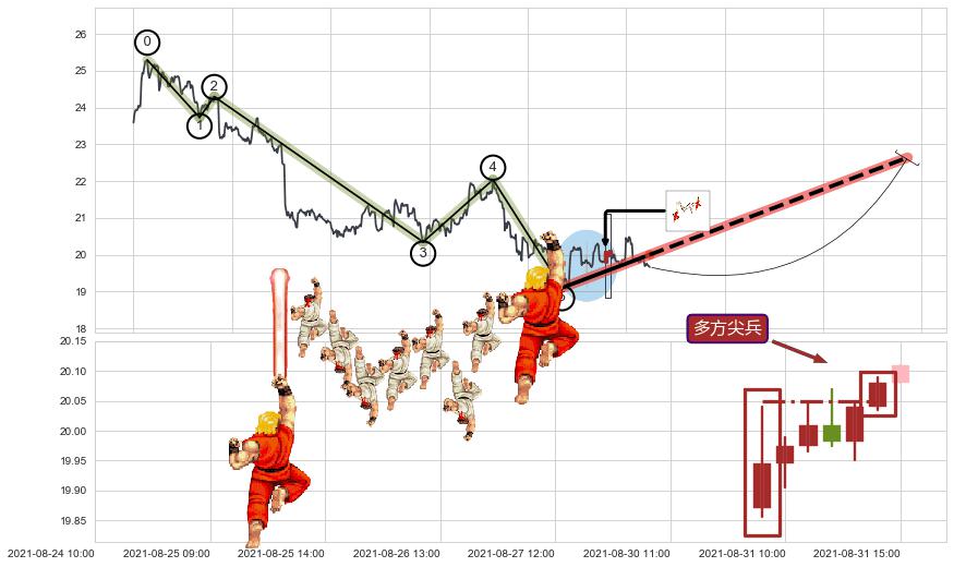 ♘ 在最后的下跌阶段2021-05-17 15:00至2021-08-27 12:00,存在 持续未破位的阻力位 ,阻力价格20.59,可信任强度79.08%,其距离最后价格19.67相差 +4.70%