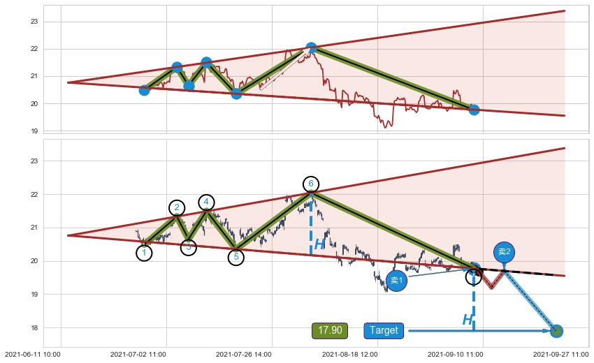 ➢ 最小反转跌幅→𝐇: 1.8732 (逐步抬高阻力斜边最后的阻力点⑥与支撑边垂直距离)