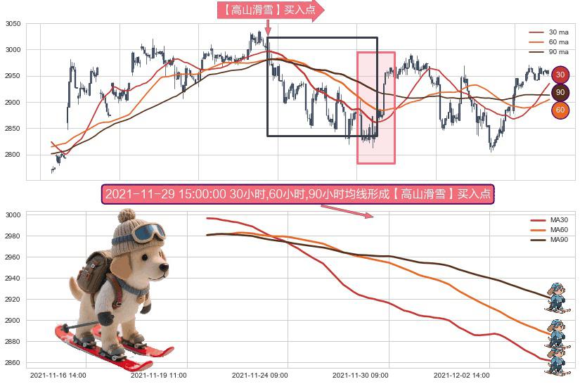 形态多维评估: ⚀ 2021-11-19 15:00:00小时-2021-12-06 11:00:00小时显现 30小时-60小时-90小时均线 【高山滑雪】买入点 看多信号,后市看涨,买入