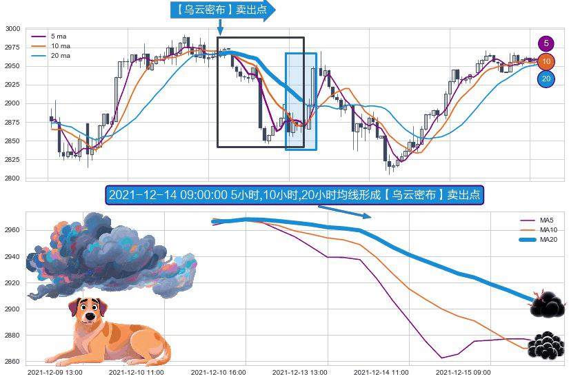 形态多维评估: ⚀ 2021-12-10 14:00:00小时-2021-12-15 12:00:00小时显现 5小时-10小时-20小时均线 【乌云密布】卖出点 看空信号,后市看跌,卖出